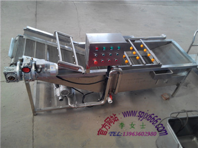 2、蔬菜清洗機:該機用于挑選好的蔬菜進行清洗,把泥沙、雜草以及異物清洗干凈出來,采用鼓風機通過管道吹進水槽里面,將水達到翻騰的狀態,模擬手工清洗,不會對蔬菜造成損害,達到清洗的效果,水槽旁邊有溢水口,溢水口上端設有過濾網裝置,清洗下來的雜草異物通過溢水口,清理出來,溢水口底部設有過濾裝置,水在循環的情況下可以將底部的泥沙等雜物過濾出來,水在循環的過程中不會再次進入到水槽和把排水口阻死的現象,排污口設計合理,可根據客戶的要求,安排位置。整機為SUS304不銹鋼材質制造,符合我國對食品衛生的需求。