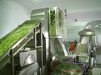 挑選帶→蔬菜清洗機→蔬菜漂洗機→切段機→提升機→震動瀝水機→提升機→蔬菜烘干設備