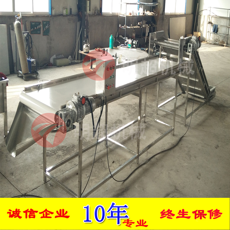 該機采用雙層進行輸送,上面一層采用pvc輸送,當蔬菜輸送到中間之后,通過強制分離裝置,分離到切菜機入口,當蔬菜從切菜機入口進入到里面,切完后再通過底層的第二層不銹鋼網帶輸送提升到下一工序,運行速度可調。
