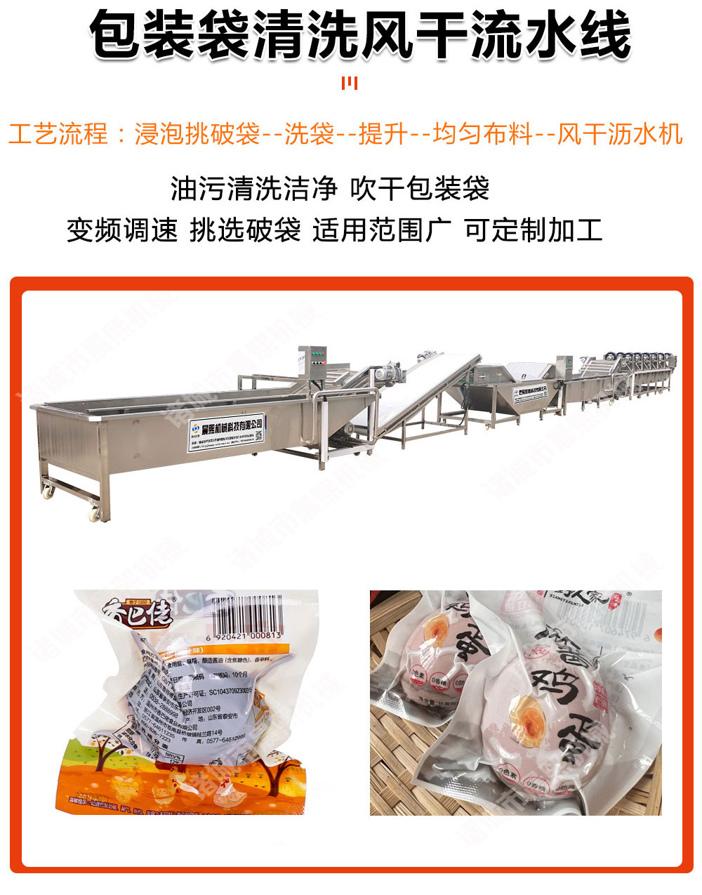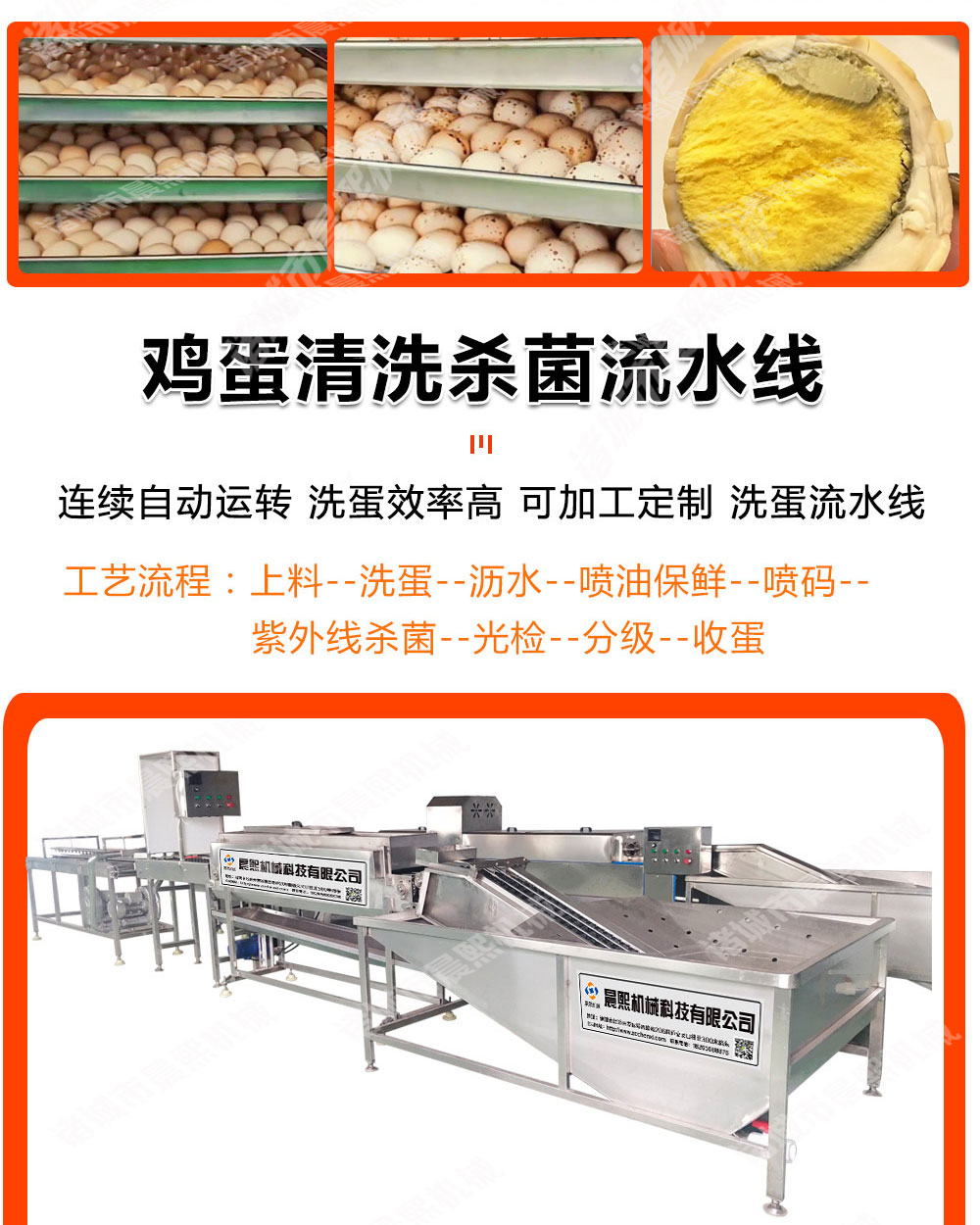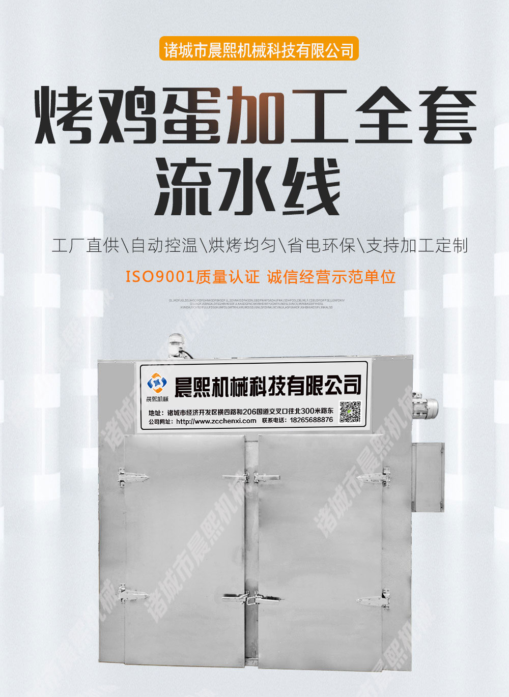 韓式即食雞蛋烘烤流水線 蛋黃烘烤箱是目前市面上新型雞蛋烘烤設備,是實現財務自由的首選設備,加工烤雞蛋需要經過清洗,殺菌,蒸煮,光檢,瀝水,腌制,烘烤,包裝,攤涼等工序完成,現在烤蛋機工藝有幾種一種是直接烘烤帶皮生雞蛋,另外一種是鹵制后進行烘烤脫皮后烤雞蛋,工藝多種多樣,不同工藝配不同的設備,那么烘烤時間多少,烘烤溫度多少這需要根據每個烤蛋工藝不同可以調試,今天咱們只介紹雞蛋烘烤流水線,加工雞蛋鴨蛋需要人工把不合格的雞蛋鴨蛋挑選出來,然后工人經過清洗后采用電加熱方式,讓雞蛋受熱均勻,達到烘烤的目的,烤盤尺寸:640*460*45mm,烤雞蛋設備有24盤,48盤,96盤,144盤,192盤,288盤等等,采用恒溫烘烤,烘烤上下左右中間一致,我們采用高溫高濕防爆風機將新鮮的空氣抽到烘烤箱內通過分封板將加熱管產生的熱氣循環于烘烤箱內,熱氣圍繞著每一個雞蛋和鴨蛋慢慢的將里面的濕氣排出產生氣體后,在通過排濕風機將濕氣排出,這樣周而復始慢慢的雞蛋鴨蛋就烘烤出來我們想要的樣子了,雞蛋烘烤過程中無需人工操作,無需翻料,節省人工,自動烘干自動排濕自動烘烤后自動報警,自動斷電,控制箱可選用數字觸摸屏,PLC等方式,具體可詳談,價格也是從幾千到十幾萬不等,下單前請先跟我們聯系,下面我們來看看雞蛋烘烤流水線,蛋黃烘烤箱加工需要全套設備有哪些,
